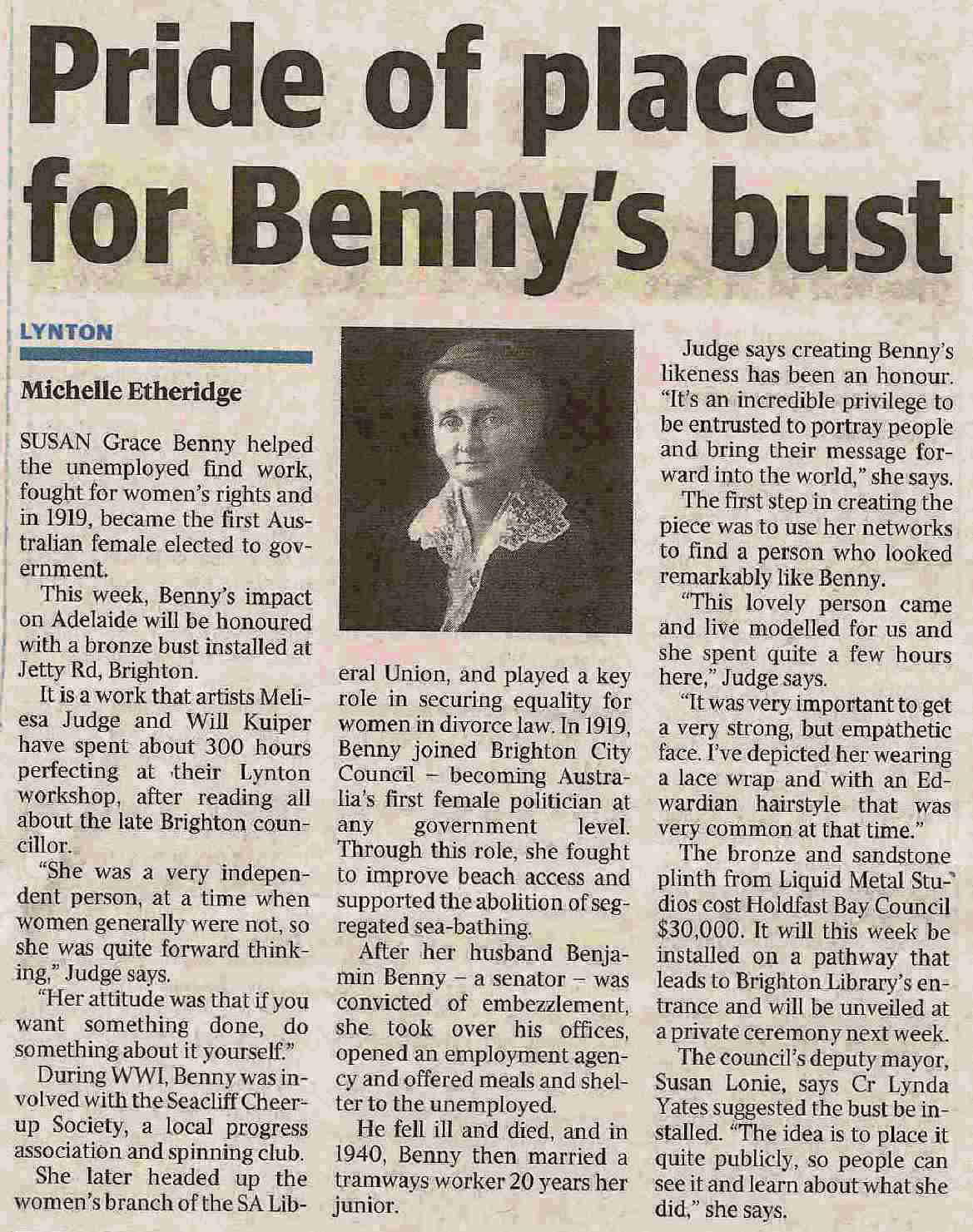 While serving on the council, Grace achieved several improvements at Brighton. Among them were the opening of a cliff to enable free access to the beach, installation of electric lights and the allotment of reserves as children's playground and public garden. She successfully supported the abolition of segregated sea-bathing making it possible for families to swim together. Whereas legislators commonly believed that women were incapable of attending night meetings, Benny regularly did so. In 1921 Susan and Benjamin celebrated their Silver Wedding anniversary.